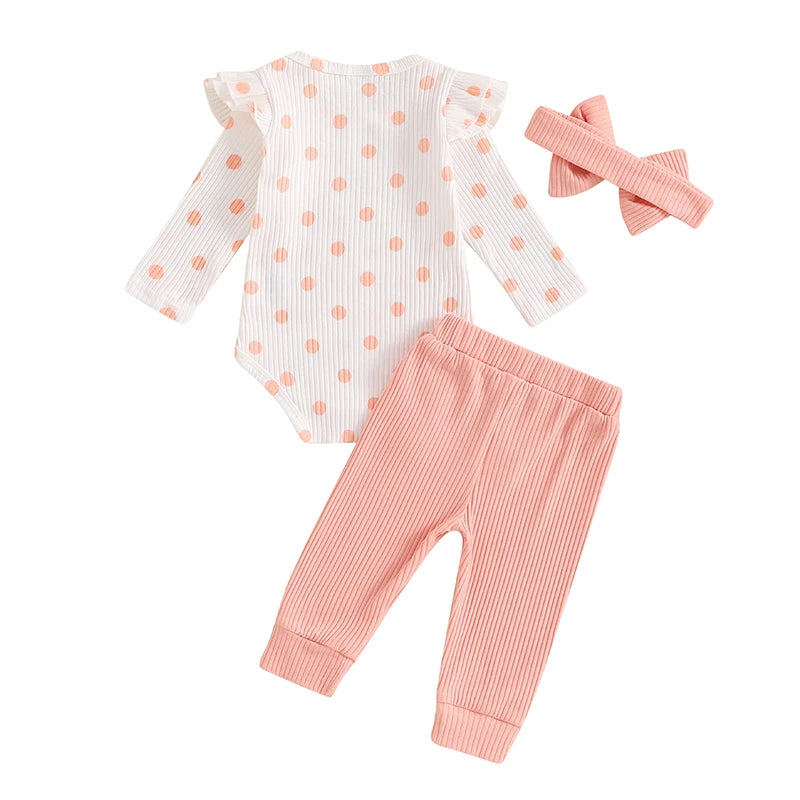 Baby Girls Fall Outfit, Long Sleeve Dots Print Romper with Pants and Bowknot Headband Clothing SetThis pants set is a very good gift for your baby girl on her birthday. She will love this 3-piece pants set. Easy outfit!