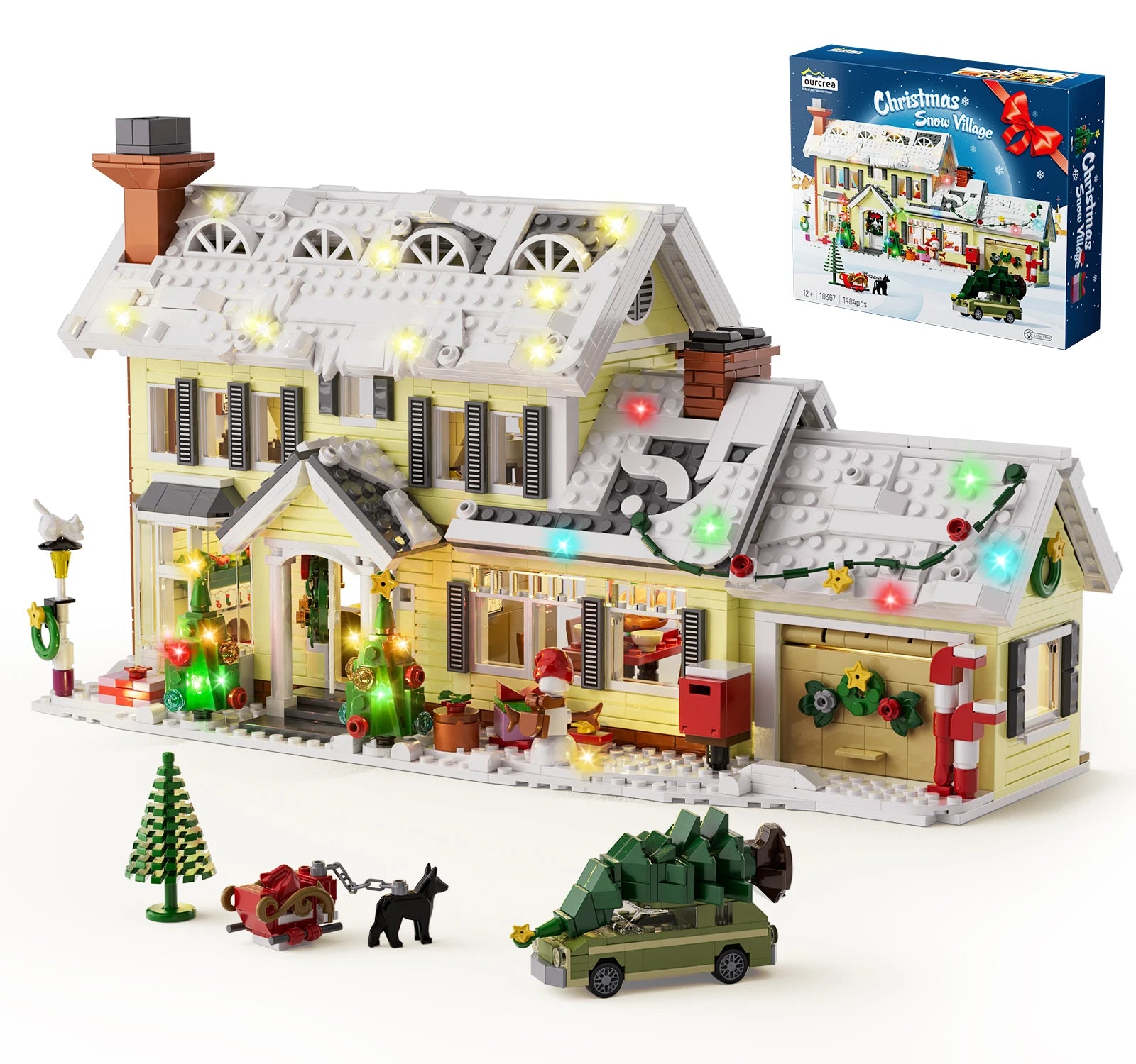 【Christmas Holiday House & Clark's Car】The Christmas holiday building house set is from a classical Christmas movie, the house decorates a snow-white roof, light-yellow walls, a main house with a garage right side, inside a black dog and sledges, also Clark's car carrying with a christmas tree, highly restores a better miniature Christmas village House