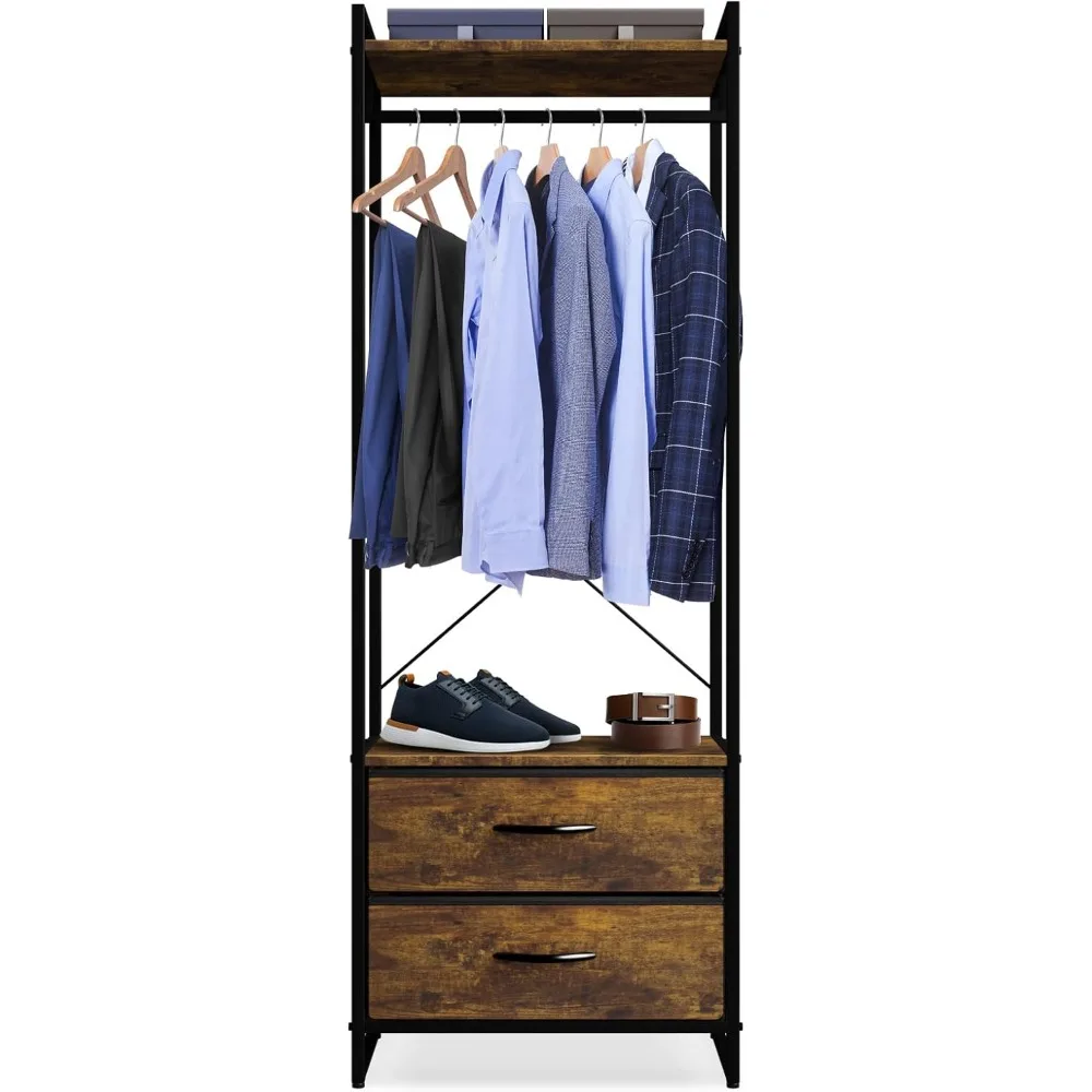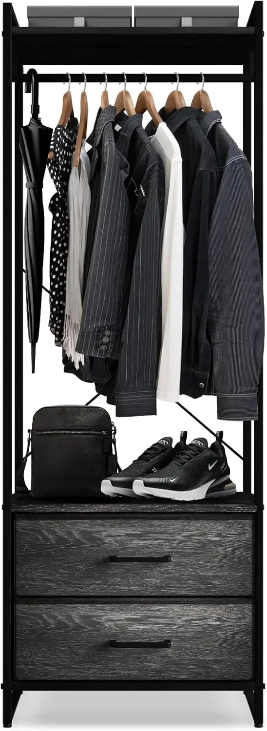 - Clothing Rack Dresser — Display your closet essentials on the Clothing Rack including shirts, dresses, pants, jackets, and more — Store smaller items in the two dresser drawers down below such as socks, underwear, & pajamas — Utilize the top shelf to store hats, purses, & boxes