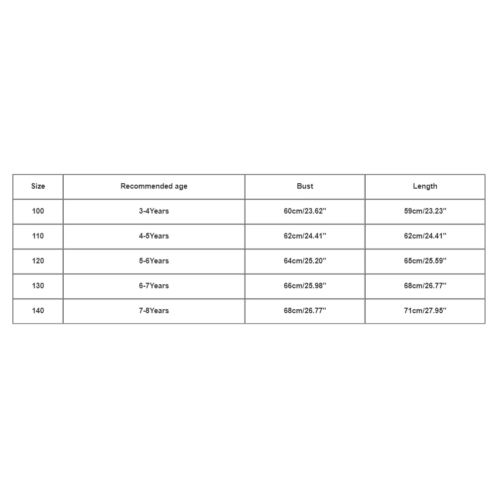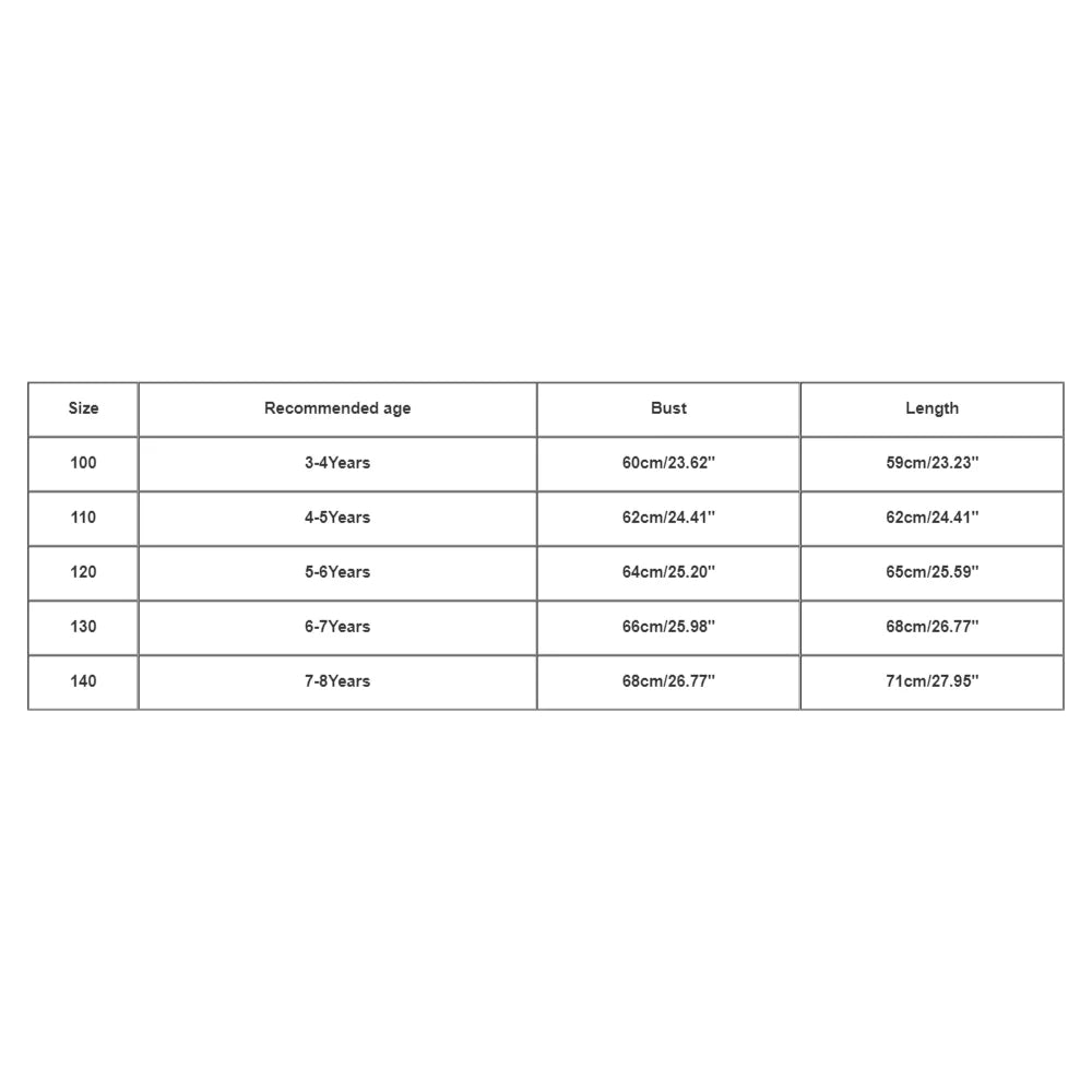| Size:140 | Recommended age:7-8Years | Bust:68cm/26.77'' | Length:71cm/27.95'' |