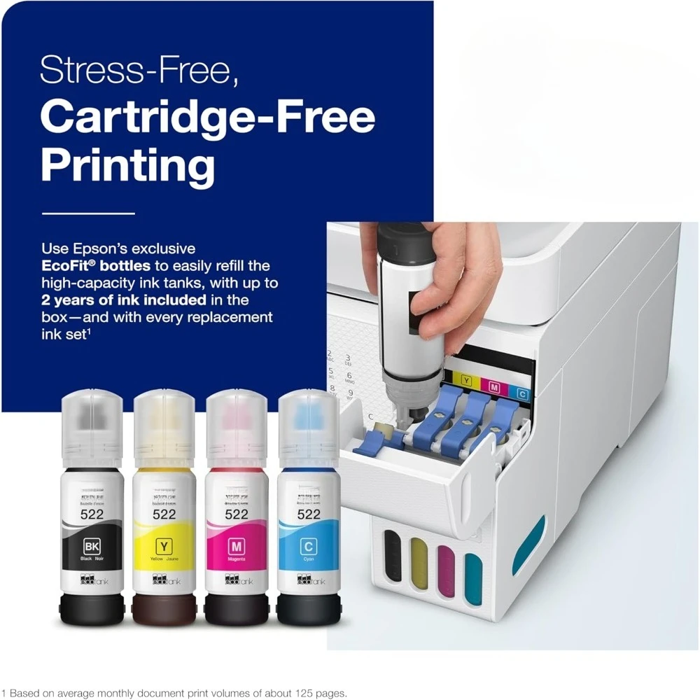 • Innovative Cartridge-Free Printing ― High-capacity ink tanks mean no more tiny, expensive ink cartridges; ’s exclusive EcoFit ink bottles make filling easy and worry-free