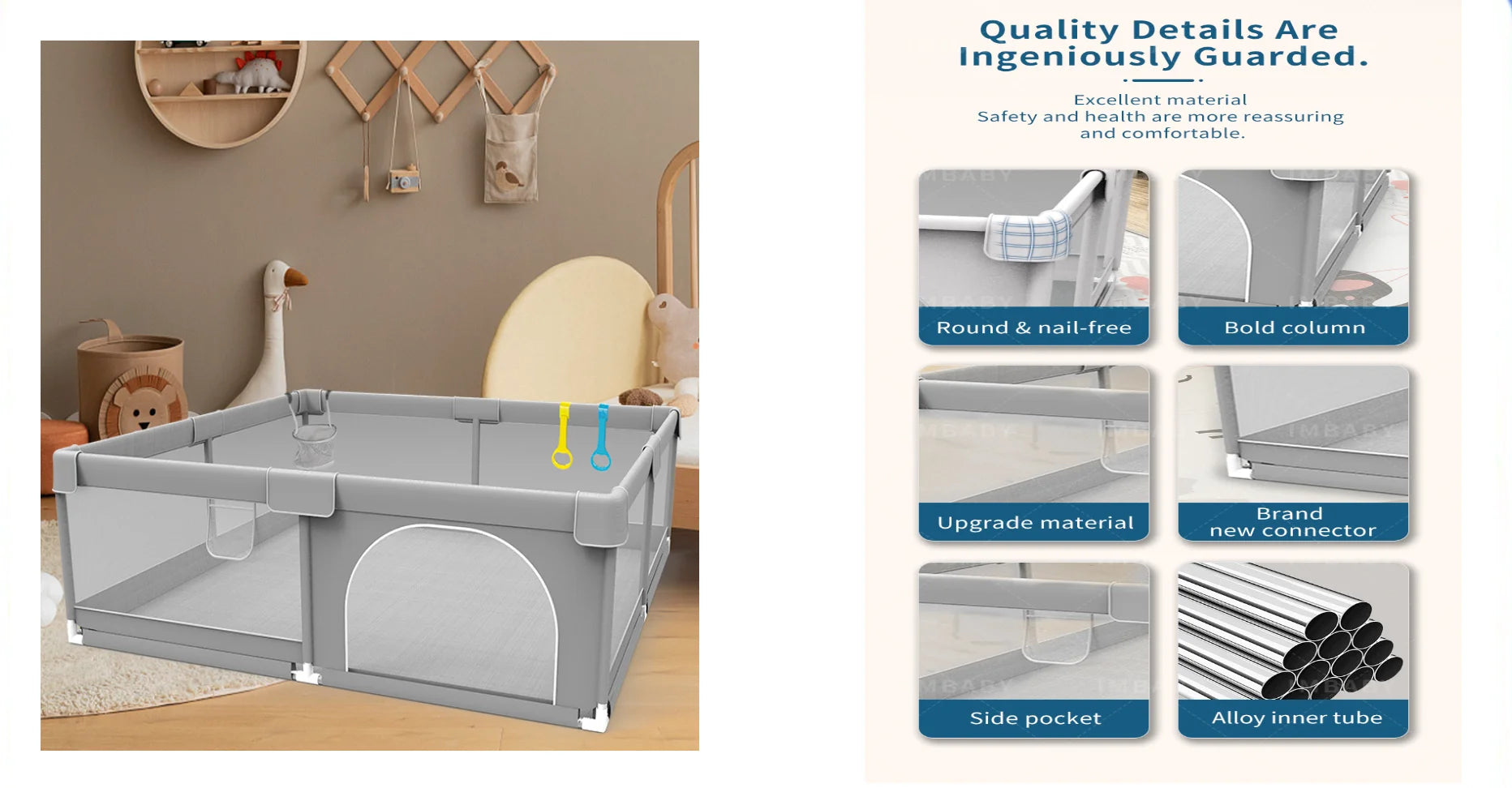 Playpen matrial: Stainless steel tube + Oxford mesh + PP plastic parts