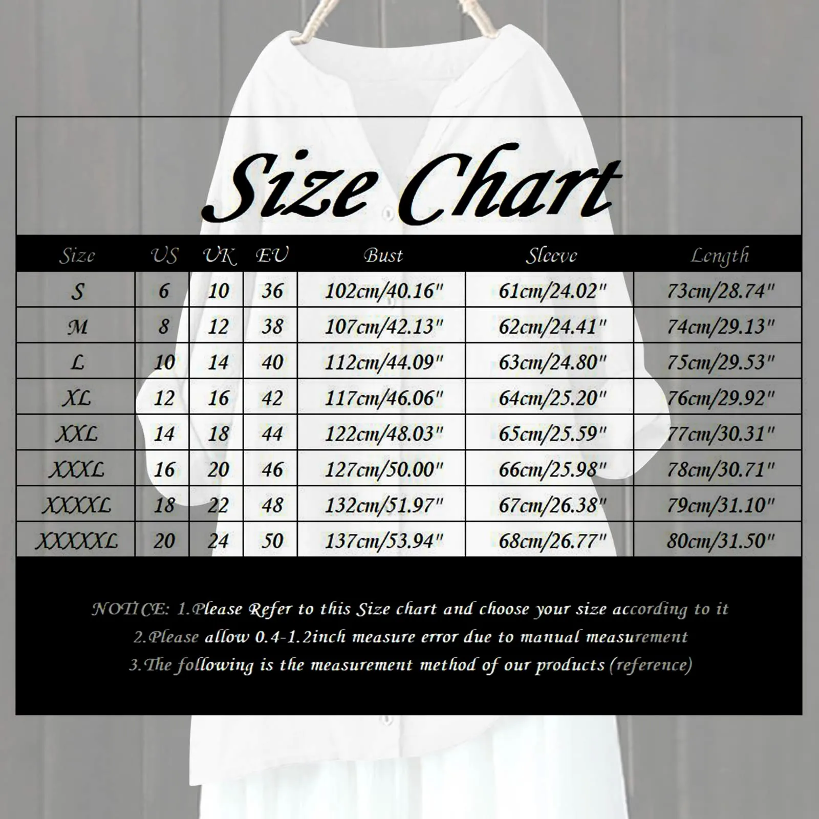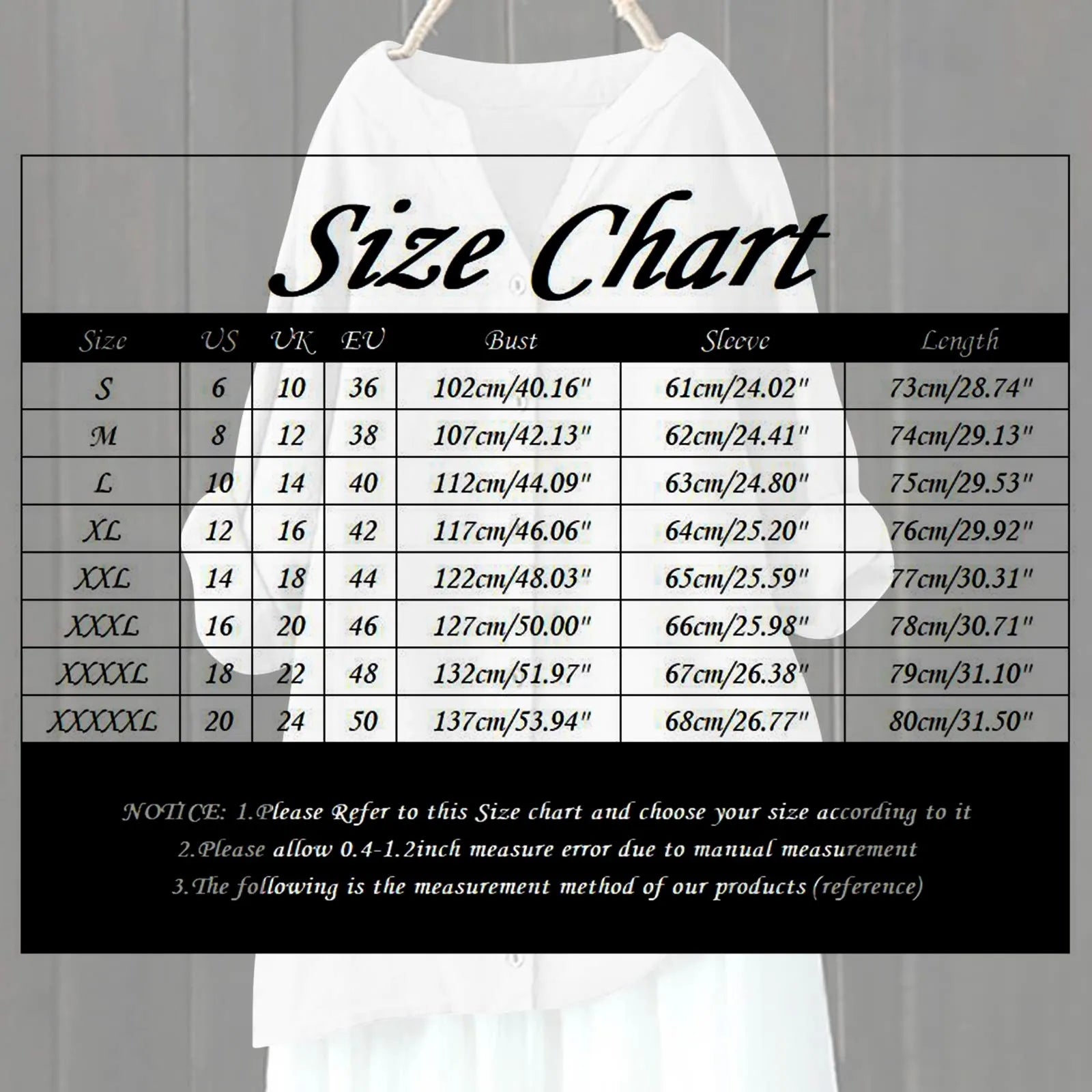 | Size:XXXXXL | US:20 | UK:24 | EU:50 | Bust:137cm/53.94'' | Sleeve:68cm/26.77'' | Length:80cm/31.50'' |