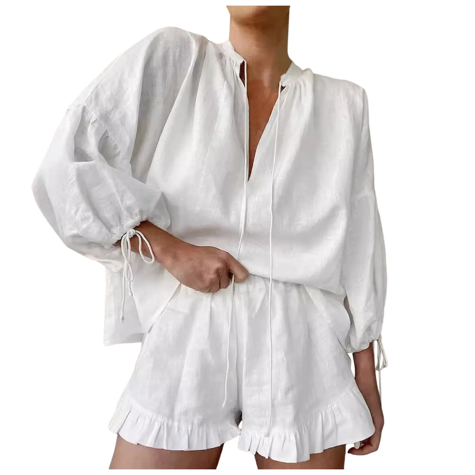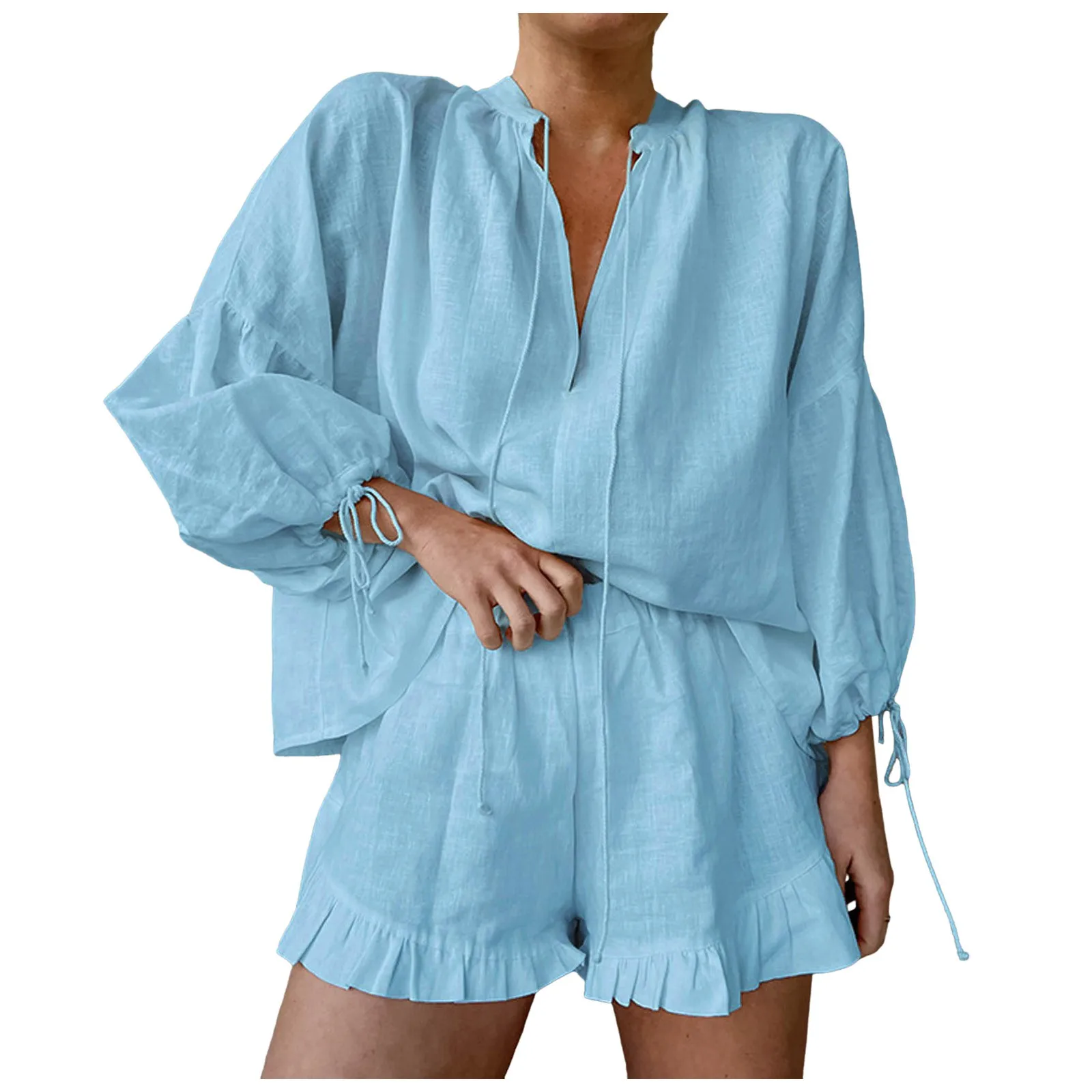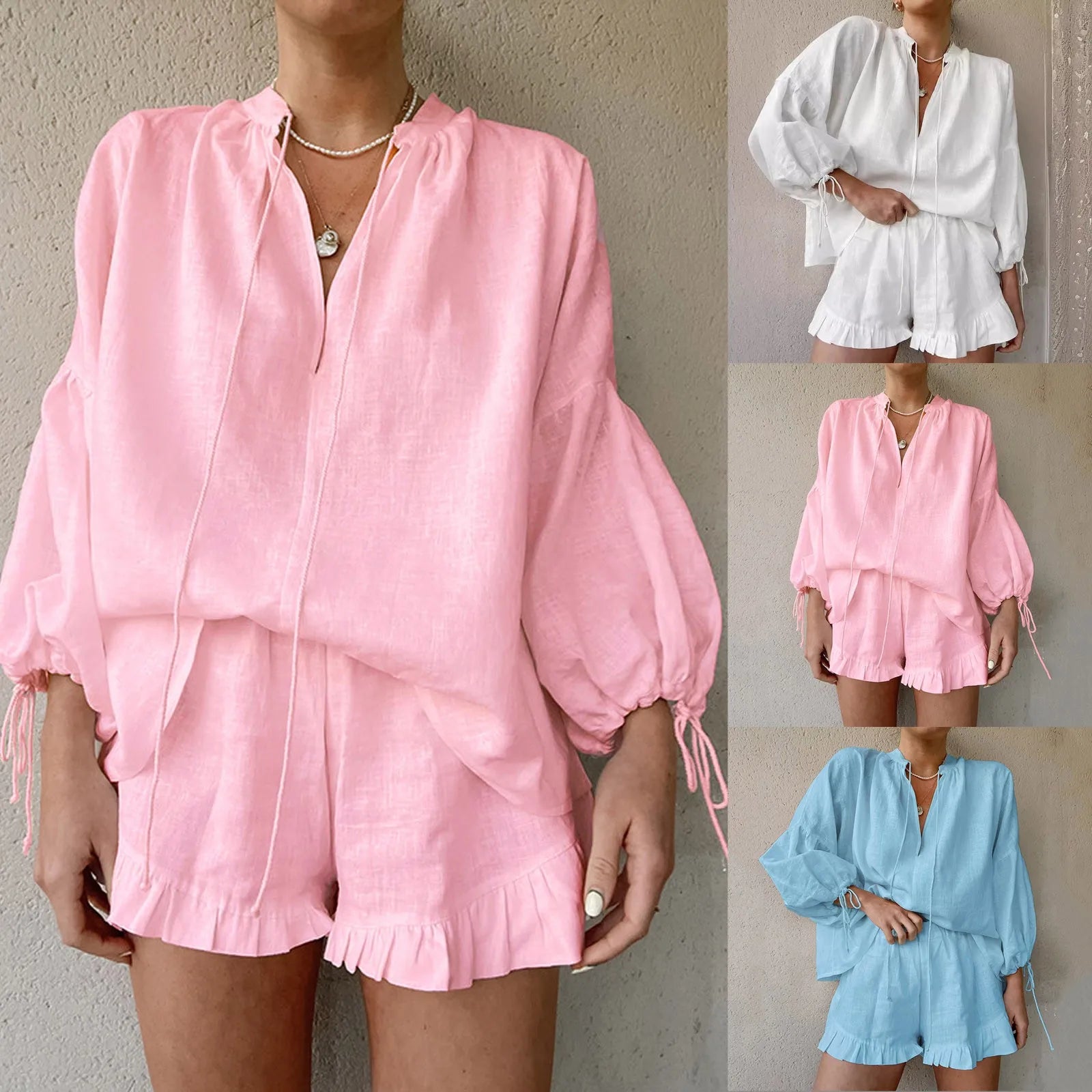 Women's Vacation Fashion Casual Suit Solid Color Summer Shorts And Shirt Top Two Piece Sets V Neck Shirt Sexy Slim Suits