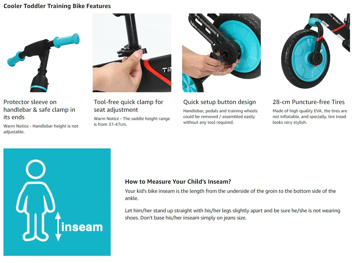 Package includes:1 x Bike frame with rear wheel 1 x Front fork with wheel 1 x Handlebar 1 x Saddle with release clamp 2 x Training wheel, 2 x Pedal 4 x Red filling pipe 1 x Manual. Made of sturdy & lightweight carbon steel; Adjustable seat & Detachable parts, grow with your baby; Red push button design for easy assembly and quick transformation; 28 cm EVA wheels are designed for different road surfaces.