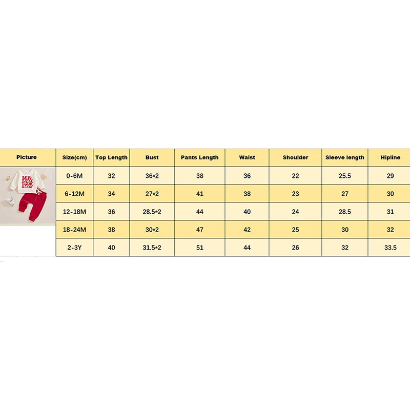 6-12M Tops Length: 34 Bust: 54 Sleeve: 27 Shoulder: 23 Pants Length: 41 Waist: 38 Hip: 60 Advised Age: 6-12 Months