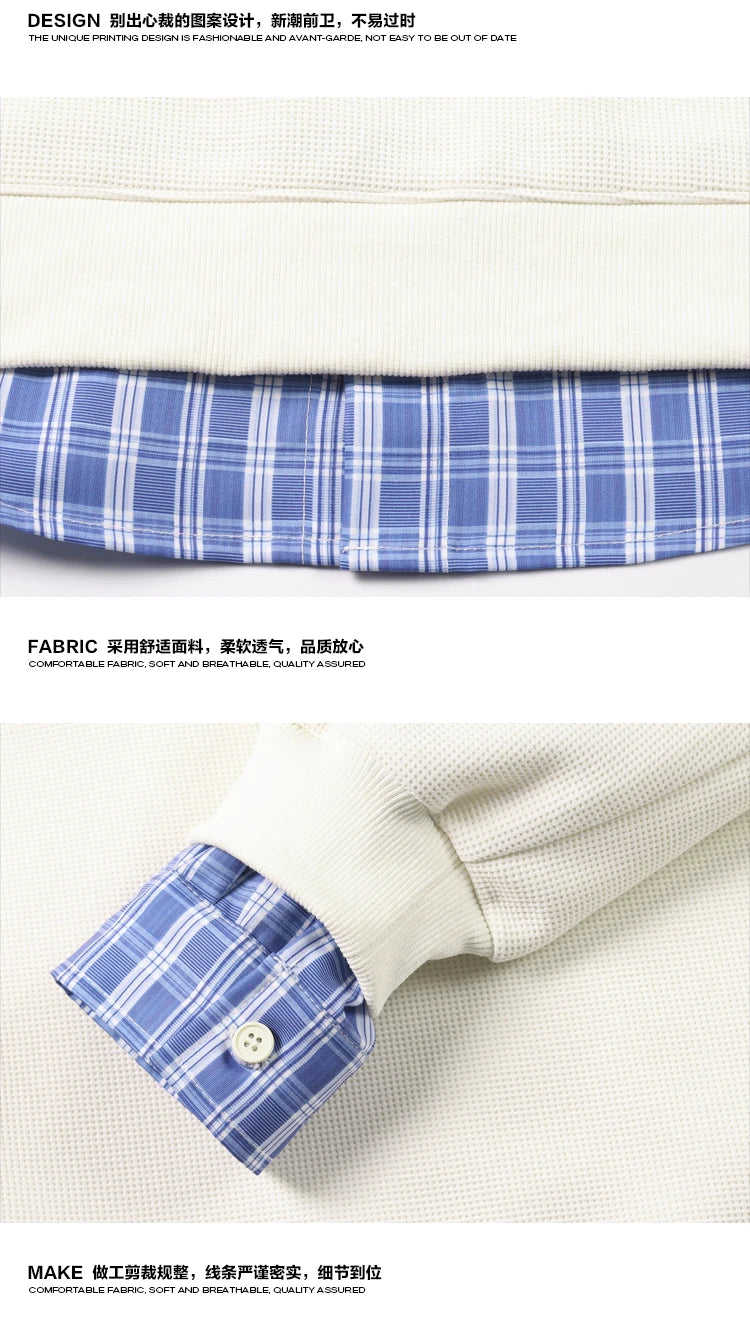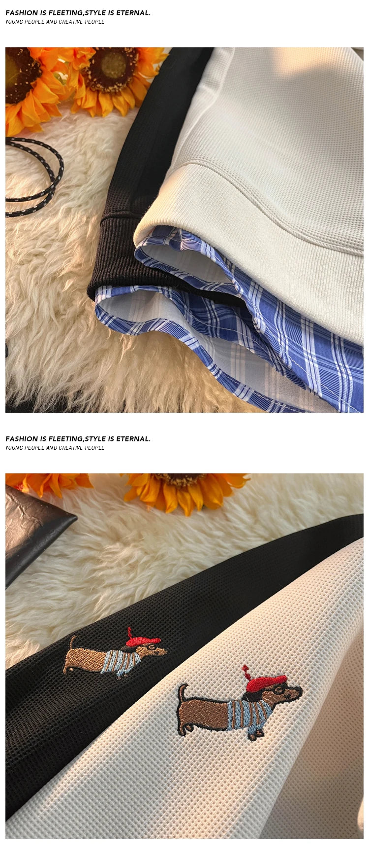 Unisex Plaid Patchwork Fake Two Sweatshirt, College Style Puppy Embroidery, POLO Collar