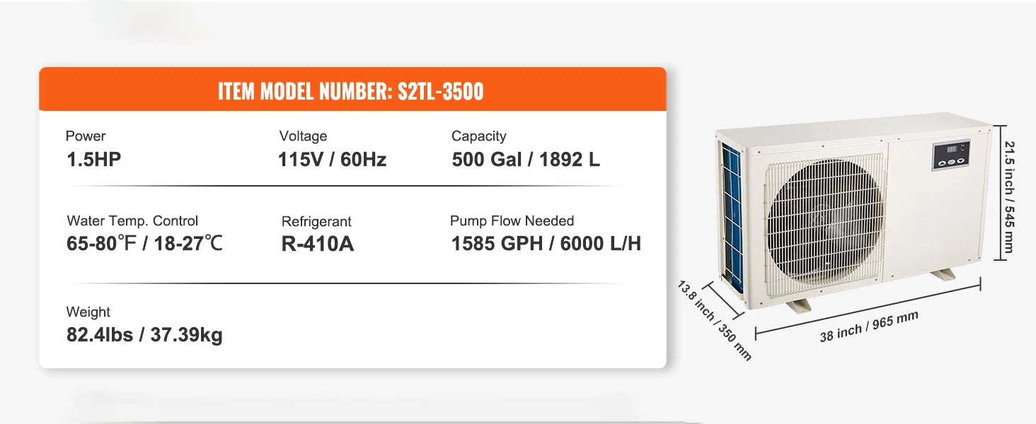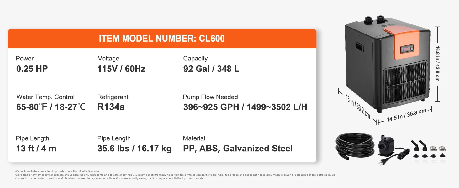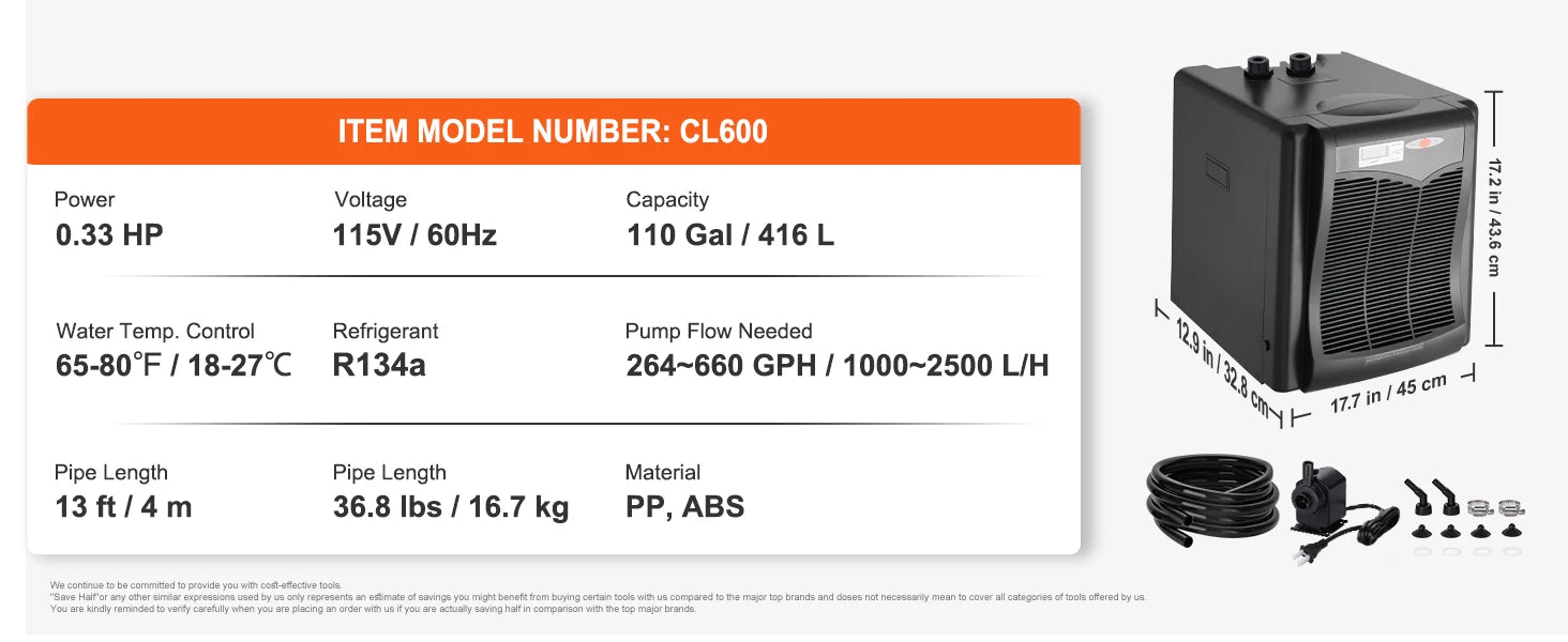0.25 HP Energy-saving Compressor: Our aquarium tank chiller uses a high-efficiency, Freon-free compressor, and R134a refrigerant. This means that the circulation and cooling water remain free from pollution. To ensure proper cooling of the chiller, we also provide a 396-925 gallons per hour water pump that delivers effective and stable water circulation.