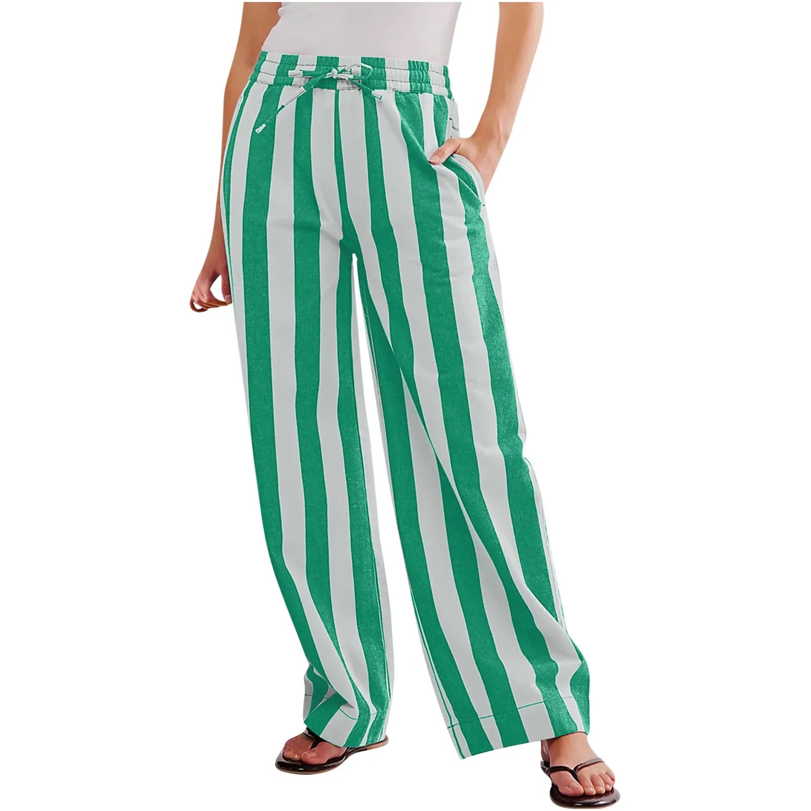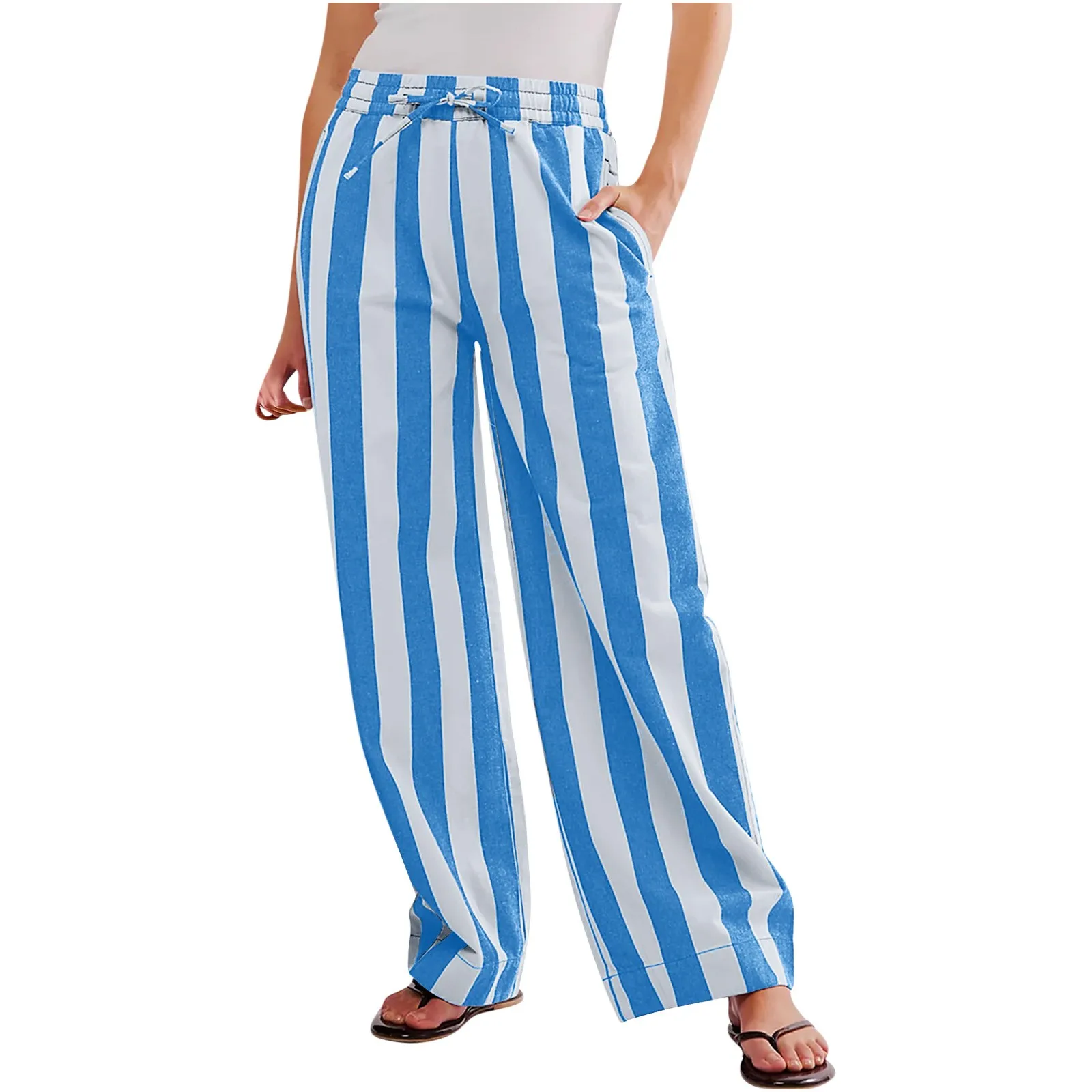 Women Stripeprint Drawstring Wide Leg Casual Trousers Low Rise Casual Loose Pants With Pockets